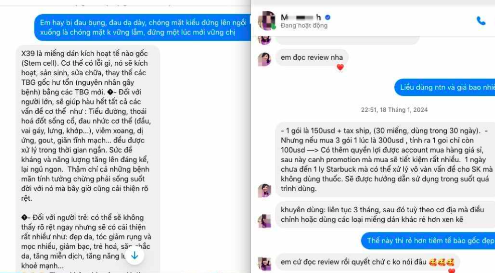 Theo tìm hiểu của phóng viên VietNamNet, người bán tên M.T, với trang facebook cá nhân có "tích xanh", thường xuyên bình luận tích cực trên facebook của vợ chồng nổi tiếng trên đây, giới thiệu miếng dán kích hoạt tế bào gốc X39 (Stem cell) theo cơ chế: "Cơ thể có lỗi gì, nó sẽ kích hoạt, sản sinh, sửa chữa, thay thế các tế bào gốc hư tổn (nguyên nhân gây bệnh) bằng các tế bào gốc mới".