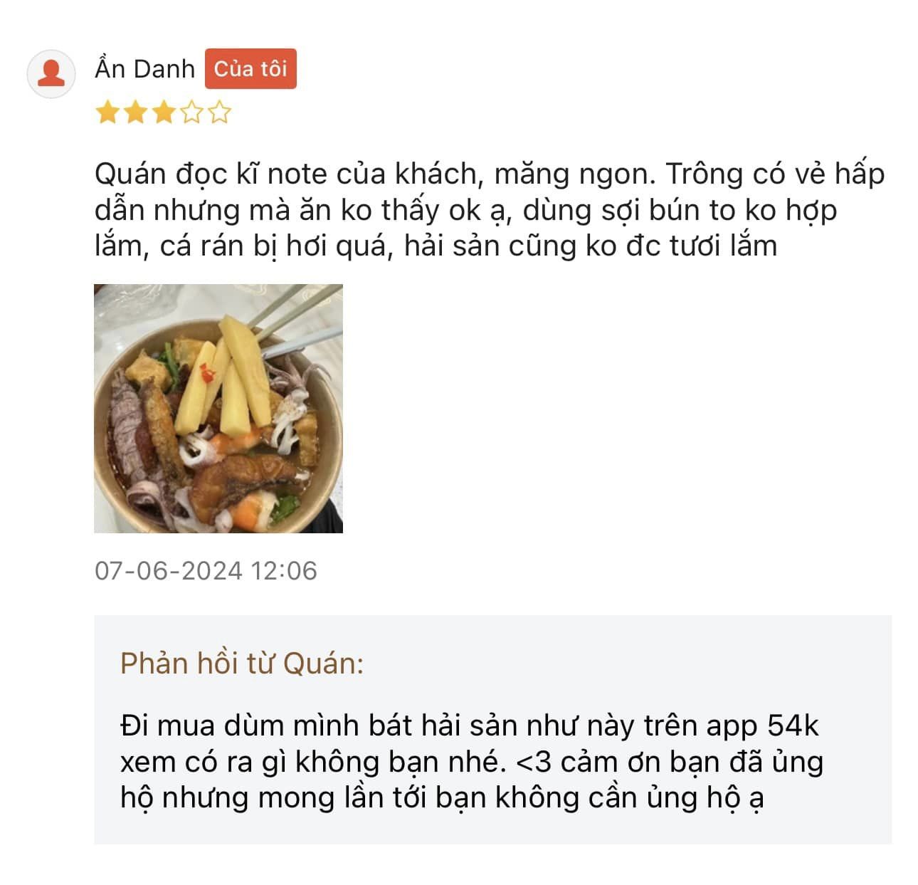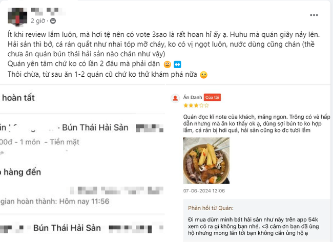 Trong bài đăng chia sẻ về trải nghiệm đặt suất bún Thái hải sản của bạn khách trên app, mặc dù đã đánh giá qua app để gửi lời đến quán nhưng khi thấy chủ quán phản hồi lại, bạn khách cho rằng đánh giá 3 sao là hoan hỉ lắm rồi.