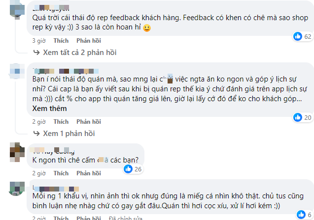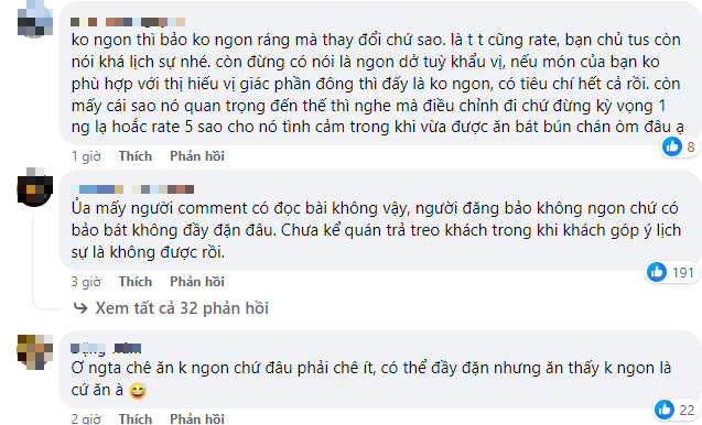 Không để khổ chủ phải chờ đợi lâu, cư dân mạng lập tức chia làm nhiều phe, người đồng tình với bạn khách, người lại cho rằng bạn này đang "bới bèo ra bọ". Về phía phản hồi của chủ quán, cũng có người đồng tình rằng kiểu "Thượng đế" này thì nên tiễn, cũng có người cho rằng ăn cảm thấy không ngon thì người ta có quyền nhận xét.