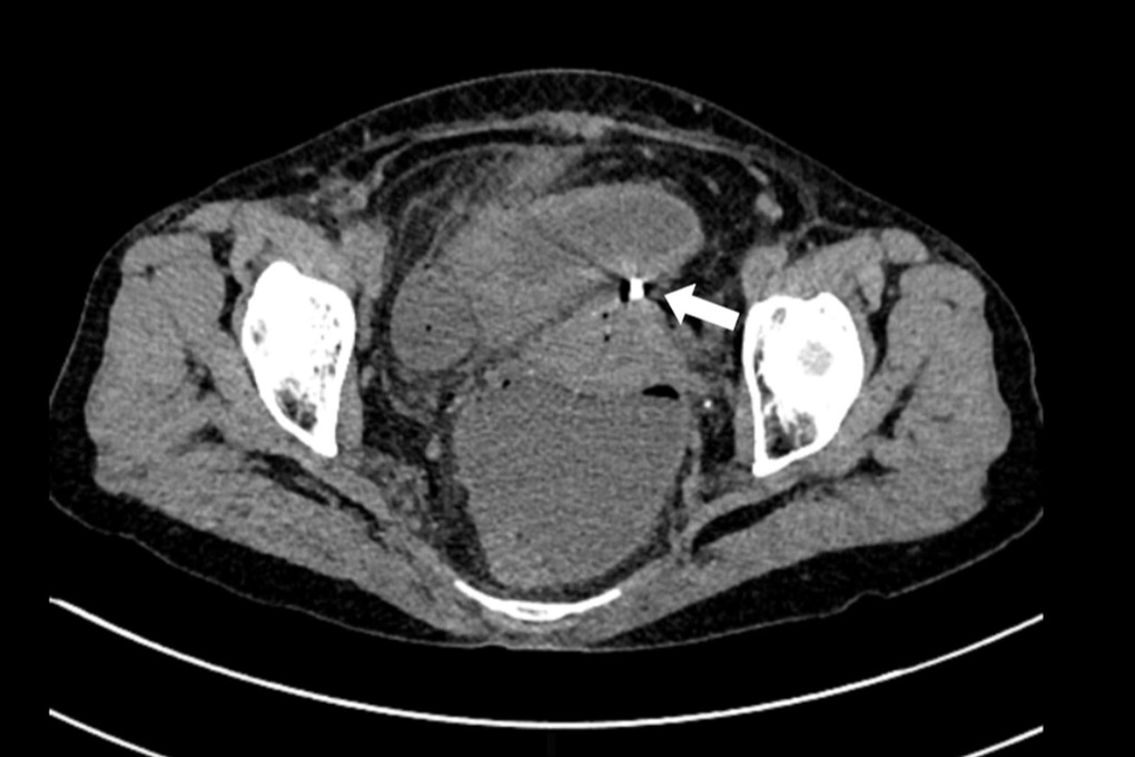 Bà đến Bệnh viện Bạch Mai trong tình trạng bụng có biểu hiện của viêm phúc mạc như bụng chướng, ấn đau. Siêu âm ổ bụng cho thấy các quai ruột ứ đọng dịch, giảm nhu động. Chụp cắt lớp vi tính thấy hình ảnh dịch khí tự do trong ổ bụng, tắc ruột cơ năng, dày thành ruột vị trí hố chậu phải và dị vật xuyên thủng đáy tử cung.