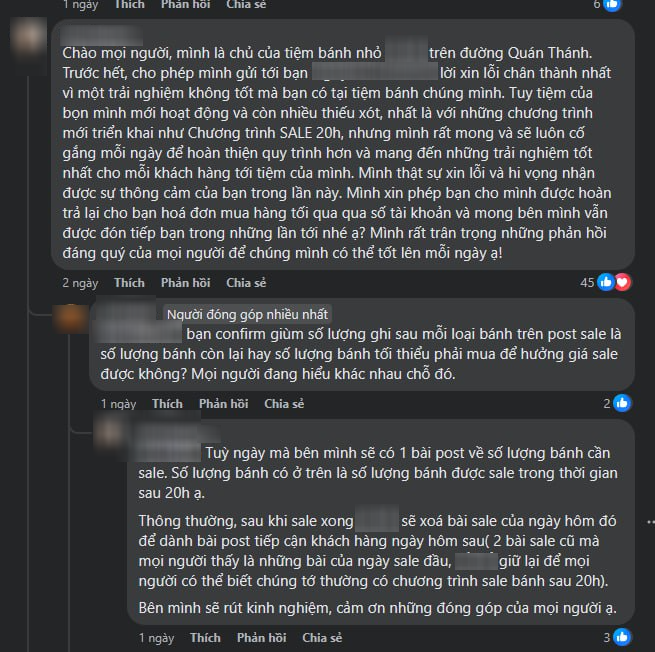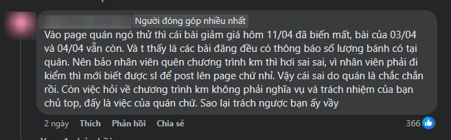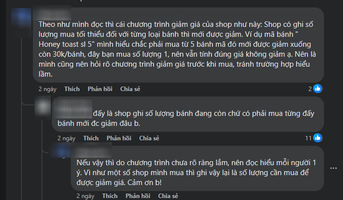 A.N. cảm thấy không thoải mái với các bán hàng của quán bánh. Cô chia sẻ thêm, đã đăng giảm giá thì khách nào đến cũng phải phổ biến thông tin cho khách, chứ không phải ai biết thì giảm, không biết thì thôi. Cô còn nói thêm, quán bán hàng như thế là không đàng hoàng.