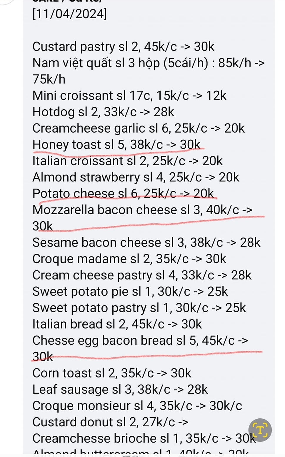 Cuối cùng sau một hồi dân tình ngồi phân tích, chủ quán đã chính thức lên tiếng về chương trình khuyến mãi sau 8 giờ tối của quán. Cụ thể từ "sl" mà quán ghi có nghĩa là số lượng bánh còn lại. Ví dụ: Custard pastry sl 2,45k/c ->30k có nghĩa là bánh Custard pastry còn lại 2 chiếc, giá gốc là 45k/chiếc, giá khuyến mại sau 8 giờ tối là 30k/chiếc.