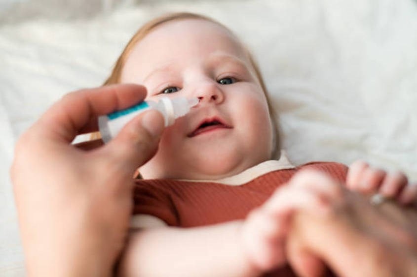 - Vệ sinh mũi trẻ hằng ngày bằng nước muối sinh lý: Trời lạnh mẹ nên ngâm lọ nước muối vào cốc nước ấm rồi mới nhỏ cho con để không ảnh hưởng đến niêm mạc mũi của bé. Với những bé đã bị bệnh về đường hô hấp thì sau khi nhỏ nước muối sinh lý mẹ nên dùng ngón tay day day 2 cánh mũi để giúp dịch nhầy bong ra, lúc này mẹ chỉ cần dùng tăm bông tẩm nước muối sinh lý vệ sinh cho con. Nếu con bị sổ mũi nhiều thì mẹ có thể dùng dụng cụ hút mũi hút hết dịch mũi ra, sau đó lại nhỏ tiếp 1-2 giọt nước muối sinh lý để mũi bé không bị đau rát.