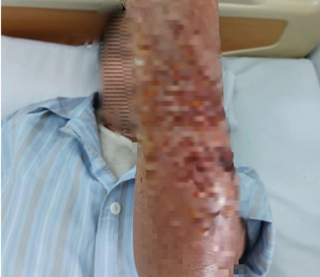 2 ngày sau, khu vực gần vết thương xuất hiện nốt đỏ kèm theo ngứa và mụn nước. Bệnh nhân không đi khám mà tiếp tục điều trị tại nhà thêm 5 ngày. Lúc này, tình trạng ở tay không đỡ.