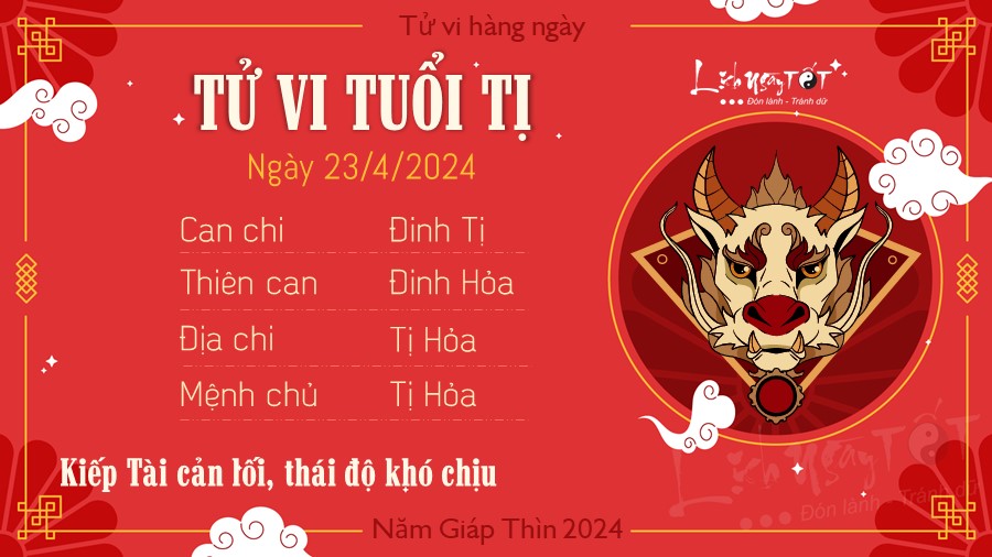 May mắn về tiền tài cũng không mỉm cười với Tị trong ngày này nên bạn đừng trông chờ nhiều. Ai chơi gian trong thương vụ làm ăn sẽ bị quả báo giáng xuống, mất cả chì lẫn chài nên hãy cẩn thận. Bạn đã dành dụm đủ một số tiền để mua xe, mua đất và nếu bạn khoe khắp nơi về dự định đó thì sắp tới sẽ có chuyện khiến bạn phải dùng số tiền đó vào việc khác.