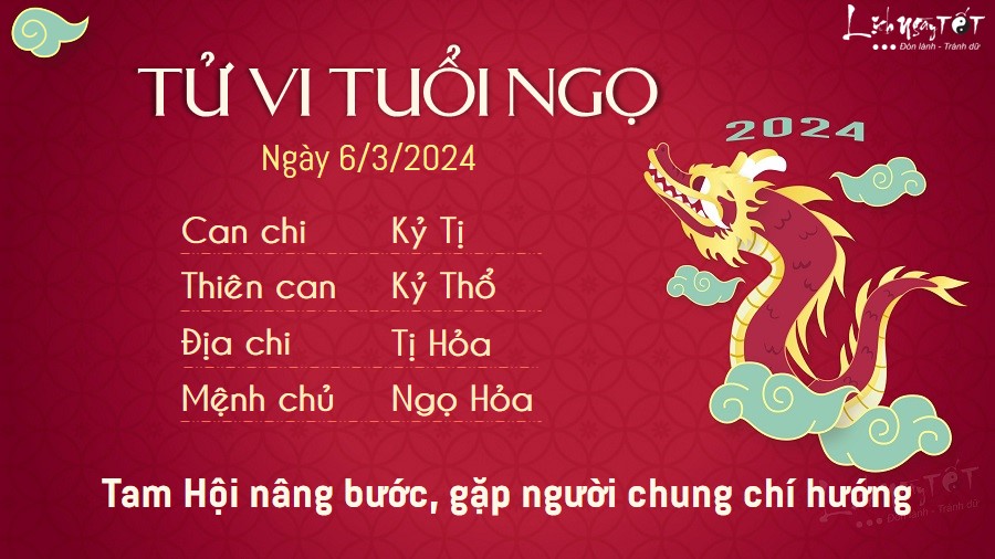 Tam Hội nâng bước, người tuổi Ngọ làm quen được với đối tác hoặc đồng nghiệp có chung ý tưởng và chung chí hướng phấn đấu trong ngày hôm nay. Đôi bên có thể trao đổi mọi việc với nhau thường xuyên và giúp đỡ nhau cùng phát triển.