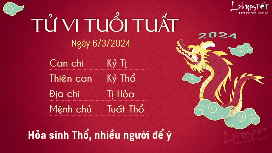 Hỏa sinh Thổ, người tuổi Tuất cởi mở và nhiệt tình nên sẽ nhận được sự chú ý của nhiều người xung quanh trong ngày hôm nay. Một số người có thể gặp được người tâm đầu ý hợp, hai người vừa gặp mà như đã quen thân từ lâu.