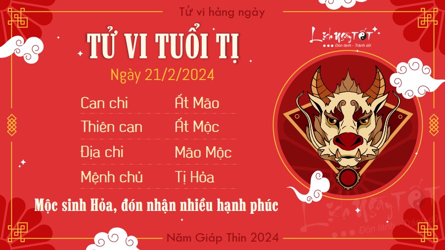 Mộc sinh Hỏa, người tuổi Tị có thể được đón nhận nhiều hạnh phúc trong ngày hôm nay. Người độc thân có thể nhận được lời ngỏ ý làm quen từ người bạn yêu mến đã lâu. Mối quan hệ của hai bạn ấm lên nhanh chóng.