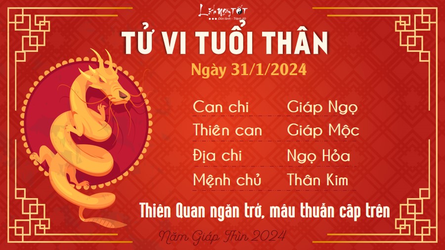 Tử vi hàng ngày 31/1/2024 của 12 con giáp thấy, Hỏa sinh Thổ, người tuổi Thìn có cơ hội đón nhận hạnh phúc trong ngày hôm nay. Sự chân thành của bạn khiến người ấy rung động và sẵn sàng cho bạn cơ hội tiến đến gần hơn.