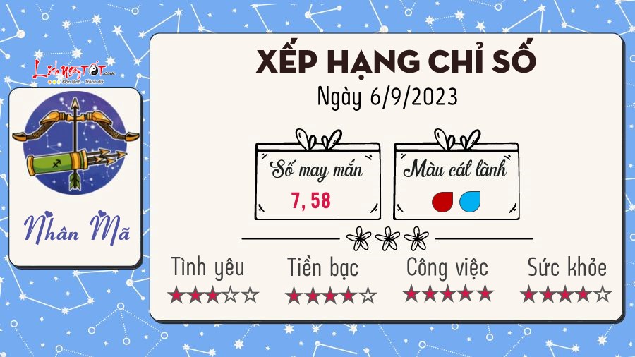 Mặt Trăng ở góc 90 độ với sao Thủy nên Nhân Mã hay thay đổi và không có cái nhìn khách quan trong ngày thứ 4 này. Sự quyết tâm và chăm chỉ của bạn sẽ được đền đáp khi bạn nhận được sự ghi nhận cho những nỗ lực của mình. Cấp trên hoặc đồng nghiệp vô cùng tin tưởng bạn nhưng đôi khi bạn lại hơi bộp chộp và bi quan, hãy xem lại nhé.