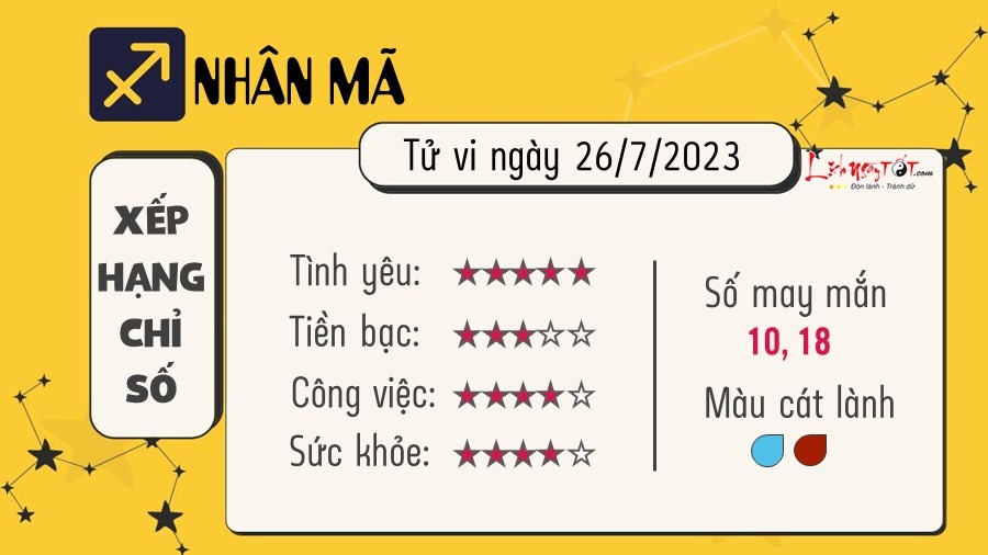 Mặt Trăng và sao Thổ tam hợp giúp Nhân Mã có cái nhìn thấu đáo trong mọi quyết định của mình hôm nay. Tại nơi làm việc, bạn cảm thấy bồn chồn và sẵn sàng cho một sự thay đổi. Hãy tin tưởng rằng mình sẽ có thể vượt qua bất kỳ khó khăn nào vì mình có tài mà! Hôm nay, bạn sẽ cảm thấy hạnh phúc và suy nghĩ tích cực. Chia sẻ năng lượng này và cảm giác này với những người xung quanh bạn, họ sẽ biết ơn bạn rất nhiều. Tập trung vào các hoạt động chăm sóc bản thân sẽ mang lại cho bạn sự bình yên và thư thái.