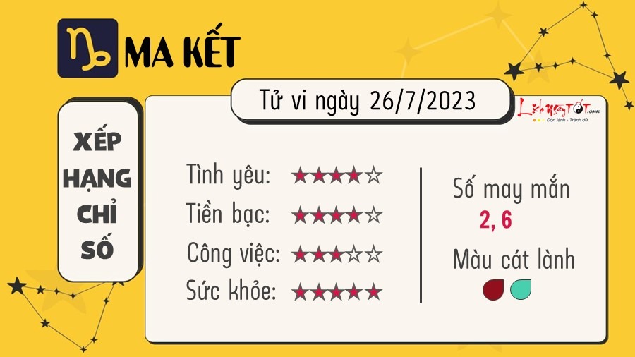 Mặt Trăng trùng tụ với tiểu hành tinh Vesta khiến Ma Kết khuếch đại trực giác và kết nối cảm xúc của mình với những người xung quanh. Bạn có thể nhận được một email hoặc một cuộc gọi liên quan đến công việc khiến tinh thần bị xuống dốc. Sự cứng nhắc trong cách quản lý khiến một số người khó chịu khi làm việc cùng bạn. Con mắt tinh tường của bạn giúp bạn có thể nhìn ra những điều nguy hiểm ở đối tượng mình đang hẹn hò. Một số người sẽ gặp phải người yêu cũ hoặc kẻ thù cũ trong hôm nay. Đi bộ nhanh có thể giúp ích cho bạn nhiều hơn là uống cà phê và mang lại cho bạn một luồng gió mớ trong suy nghĩ.