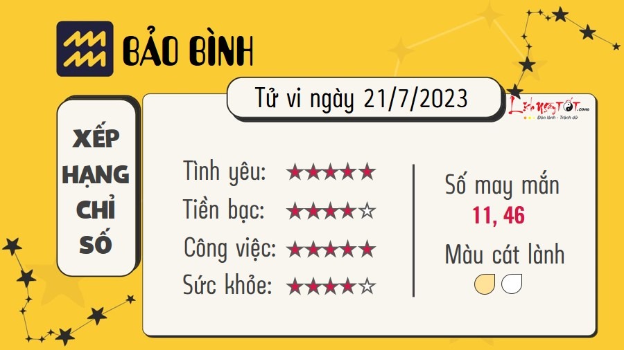 Bảo Bình tốt bụng luôn sẵn sàng giúp đỡ mọi người xung quanh. Trong thời điểm Mặt Trăng hợp thành góc 120 độ với sao Mộc, bạn được nhiều người yêu mến. Nhờ phát huy được các thế mạnh trong công việc mà bạn gặt hái được thành tích tốt và được lãnh đạo đánh giá cao. Hãy tiếp tục tinh thần làm việc này nhé. Mối quan hệ của bạn và người ấy trở nên vô cùng gần gũi. Bạn thường xuyên dành thời gian trò chuyện với đối phương để hai người hiểu thêm về nhau. Hãy thử sức ở những lĩnh vực làm ăn mới mẻ hơn xem sao. Dù có thể sẽ phải hơi vất vả một chút, song bạn sẽ phát hiện ra nhiều tiềm năng của mình.