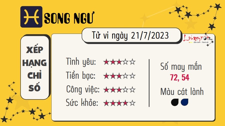 Trong ngày hôm nay, thời điểm Mặt Trăng tạo nên góc 45 độ với Mặt Trời, Song Ngư trở nên khá nhạy cảm. Bạn dễ bị tác động bởi lời nói của người khác. Đừng suy diễn lời nói hoặc hành động của người khác quá mức rồi lại thành ra tổn thương. Nếu có gì chưa hiểu, bạn nên hỏi trực tiếp đối phương. Sự áp đặt của bạn có thể khiến cho nửa kia cảm thấy mệt mỏi. Hãy thay đổi tính cách này của mình và cho đối phương quyền tự do quyết định những gì mà người ấy muốn. Việc kiếm tiền chẳng mấy thuận lợi bởi bạn dễ xảy ra tranh cãi với khách hàng, đối tác. Tốt nhất bạn nên tìm cách hòa giải, chớ “chuyện bé xé ra to”.