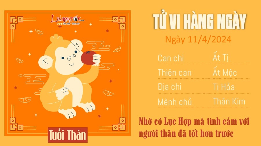 Ngày 11/4/2024, nhờ có Lục Hợp mà tình cảm với người thân đã tốt hơn trước, không những thế, các con giáp tuổi Thân đã kết hôn sẽ tận hưởng một khoảng thời gian thuận lợi, hài hòa, khi hai người yêu thương và quan tâm lẫn nhau.