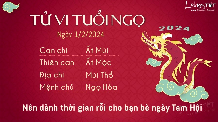 Trong ngày Tam Hội, tuổi Ngọ không nên có những thay đổi nào quá bất ngờ. Tốt nhất là án binh bất động, dành thời gian rỗi rãi cho bạn bè, thay vì tới nơi hẹn hò.