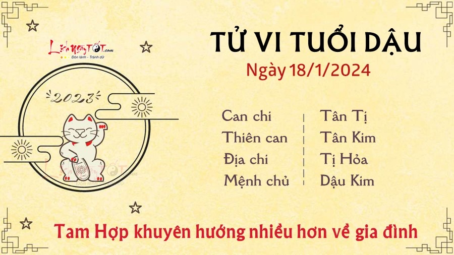 Tử vi hàng ngày 18/1/2024 của 12 con giáp, những tín hiệu đáng mừng của người tuổi Dậu độc thân khi bạn đang có đối tượng để mắt tới. Ngoài ra Tam Hợp là thời điểm bạn hướng nhiều hơn về gia đình nhỏ của mình. Người có gia đình nên ưu tiên dành thời gian cho vợ chồng, con cái.