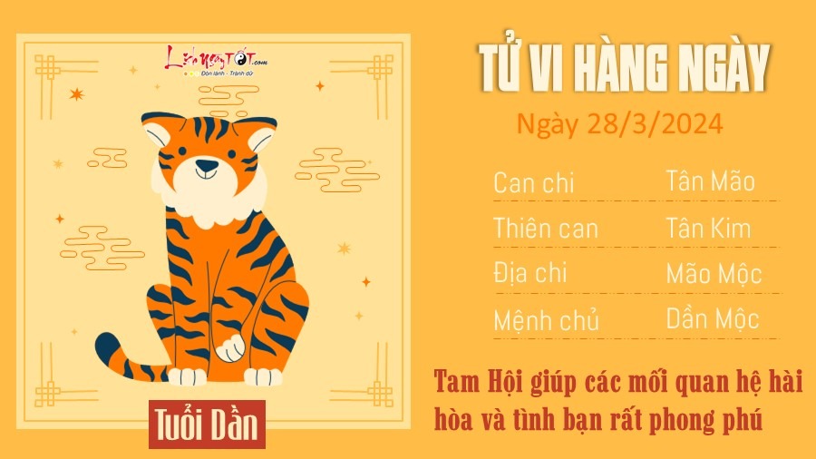 Tử vi hàng ngày 28/3/2024, hôm nay có Tam Hội dẫn đường chỉ lối nên các mối quan hệ của tuổi Dần khá hài hòa và tình bạn của bản mệnh thời gian này rất phong phú, đầy màu sắc. Những cuộc gặp gỡ với bạn bè cho bạn cơ hội trút bầu tâm sự, giải tỏa căng thẳng trong lòng.
