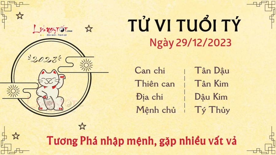 Tiếp nối tử vi hàng ngày 28/12/2023, tuổi Tý gặp nhiều vất vả trong ngày bị Tương Phá tác động. Bạn có xu hướng tách biệt với mọi người, do đó rất khó nhận được sự trợ giúp của người khác khi xảy ra vấn đề. Con giáp này có nhiều suy nghĩ cực đoan, tiêu cực dẫn đến hành động thiếu kiểm soát.