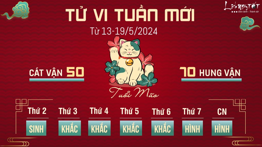 Một số lo lắng của tuổi Mão về khía cạnh tình cảm của mình có thể xảy ra trong tuần này. Khi đối diện với một số rắc rối, bản mệnh càng cần thể hiện bản lĩnh của mình, xử lý một cách êm thấm để cứu lấy hạnh phúc bạn nhé.