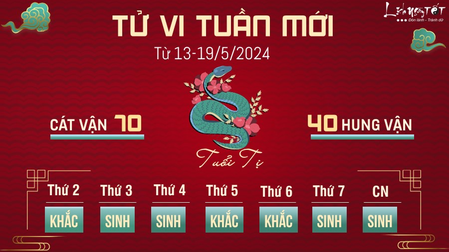Vận trình công việc tuần này của tuổi Tị cũng có thể diễn ra như ý. Nếu đang tìm việc làm, đây có thể là thời điểm bạn trúng tuyển hoặc tìm được nhiều cơ hội trời cho. Công việc phát triển đồng nghĩa với việc bạn phải dành nhiều thời gian tập trung vào nó.