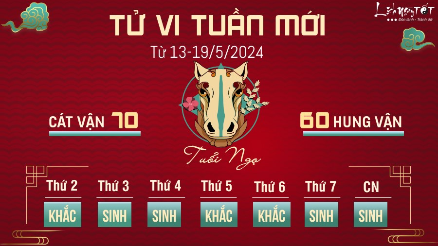 Đầu tuần này của tuổi Ngọ diễn ra khá êm đềm và đặc biệt là cuối tuần sẽ mang lại nhiều tiền bạc, lợi nhuận cho bản mệnh với sự giúp sức của Thiên Tài. Nhìn chung, những vấn đề về tiền sẽ được sớm xử lý trong thời gian ngắn.