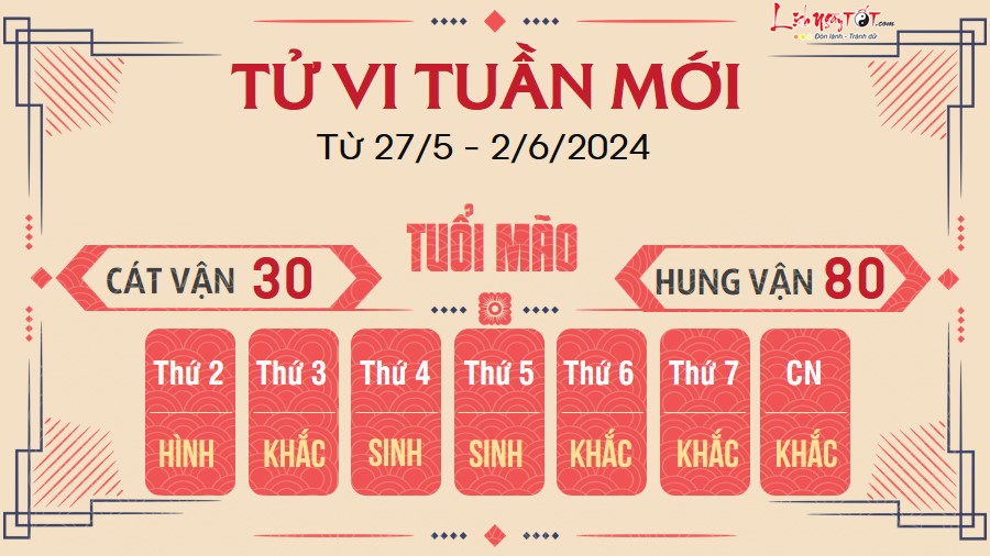 Tuần này có thể là một tuần khá khó khăn đối với người tuổi Mão. Bản mệnh quá kiêu ngạo, tự coi mình là nhất, từ chối hợp tác với mọi người nên dễ gặp phải rắc rối. Bên cạnh đó, bạn cũng không biết cách thay đổi góc độ đánh giá vấn đề nên càng lâm vào ngõ cụt.