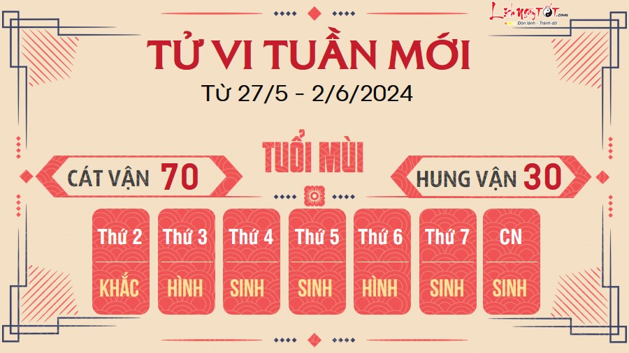Tuần này là một tuần làm việc vô cùng may mắn đối với người tuổi Mùi. Bạn có cơ hội gặp gỡ quý nhân và được đối phương giới thiệu cho những cơ hội đáng quý. Bạn cũng được đối phương chỉ ra điểm yếu để nhanh chóng khắc phục.