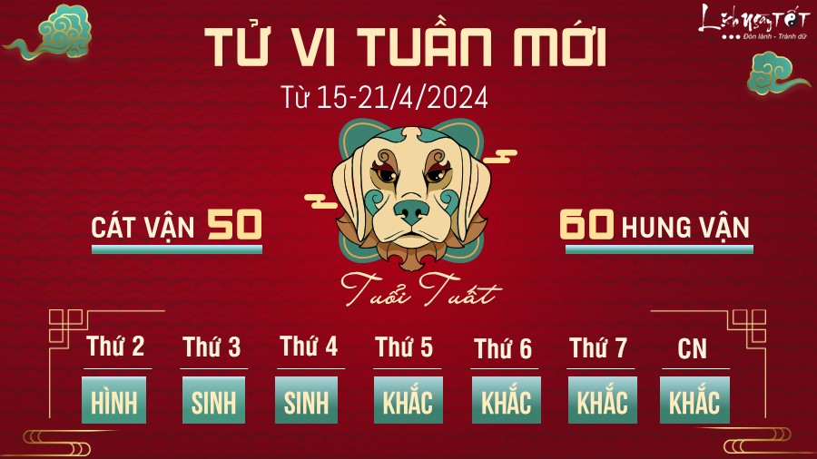 Người tuổi Tuất đang có quá nhiều lo lắng trong lòng nên không dám thực hiện bước tiến nào trong tuần này, đó chính là rắc rối lớn nhất. Lời khuyên cho bạn đó là nên dám thực hiện những bước đi đầu tiên vì khi đó bạn sẽ biết mình nên làm gì, đừng để nỗi sợ ngăn cản bạn.