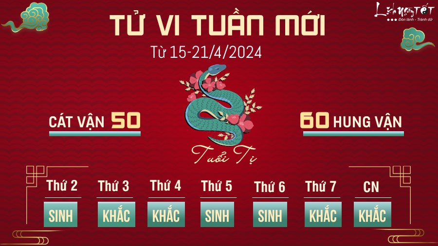 Những ngày giữa tuần của tuổi Tị là rực rỡ nhất với sự che chở của Chính Tài mang lại cho bạn tiền bạc hoặc phần thưởng, sau đó có chút khó khăn bạn cũng không cảm thấy cần phải lo lắng quá.