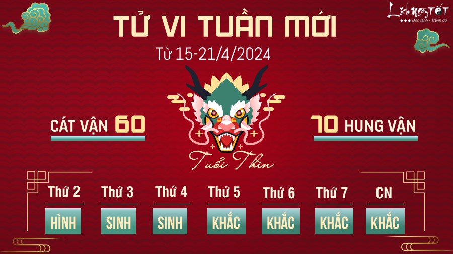 Đầu tuần đối mặt với Kiếp Tài khiến con giáp tuổi Thìn có chút tức giận, khó chịu nhưng may mắn mọi việc sau đó sẽ suôn sẻ, nhất là cuối tuần hứa hẹn có những dự báo khả quan về tiền bạc.