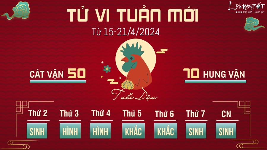 Chuyện tình cảm của tuổi Dậu tuần này không được thuận lợi khi hai người thường xuyên có những ý kiến trái ngược, không ai chịu hạ cái tôi của mình xuống. Để nhà cửa được êm ấm, lời khuyên là bản mệnh nên nhường người ấy một bước.