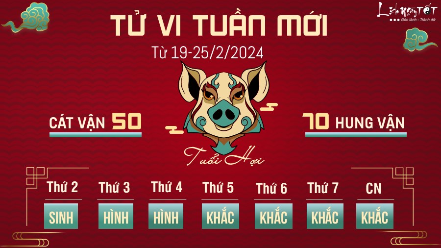 Đầu tuần tâm lý của người tuổi Hợi còn nhiều xáo trộn, lo âu, tuy nhiên đến cuối tuần có Chính Quan nâng đỡ nên bạn có thể thở phào nhẹ nhõm khi mọi việc đã được xử lý. Hứa hẹn trong thời gian tới tâm lý của bạn sẽ thoải mái hơn.