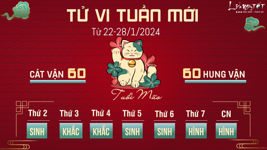 Tuần này dù có nhiều thăng trầm nhưng con giáp tuổi Mão hãy luôn giữ niềm tin tích cực nhé vì cuối tuần mới là thời gian rực rỡ nhất của bản mệnh. Thiên Tài ghé thăm sẽ mang lại cho bạn rất nhiều tiền bạc, việc buôn bán thuận lợi, có nhiều đơn hàng hơn bạn từng nghĩ.