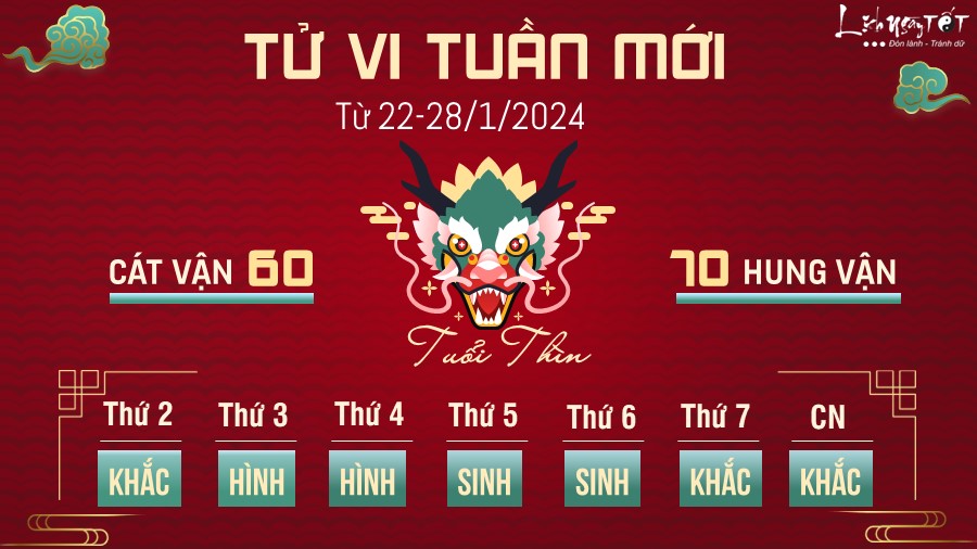 Bước sang tuần mới, khuyên tuổi Thìn là đừng tìm cách tự mình làm hết mọi việc, thay vào đó hãy cố gắng làm tốt công tác quản lý và phân công công việc một cách khoa học để nâng cao hiệu quả công việc. Đây là lúc bạn cần đến sự giúp đỡ của những người xung quanh.
