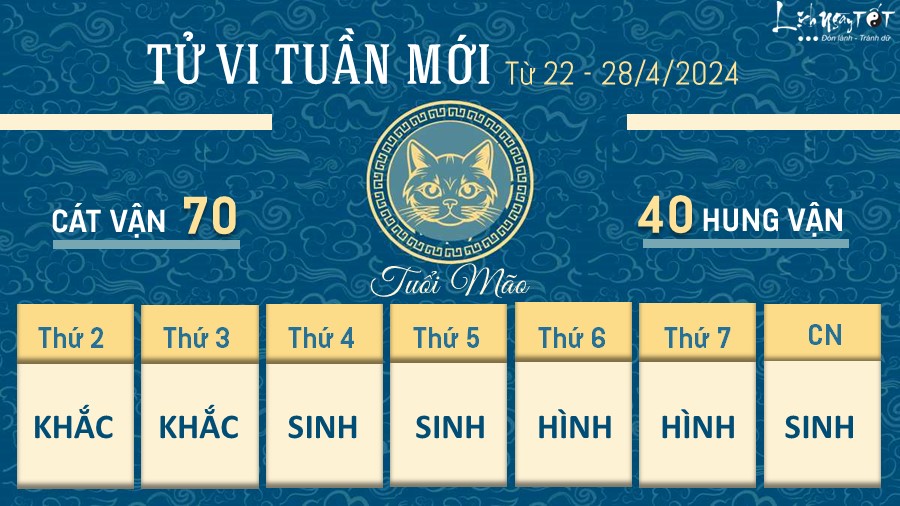 Bước sang tuần mới, Thái Dương cát tinh giúp người tuổi Mão làm việc với nguồn năng lượng tích cực, cũng bởi vậy, bạn đạt được nhiều thành tích khởi sắc trong công việc. Bản mệnh vẫn đang cố gắng hoàn thành tốt công việc của mình, được cấp trên ghi nhận và ưu ái dành cho nhiều cơ hội để phát triển hơn trong tương lai.