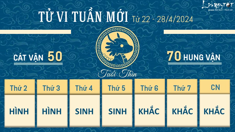 Hung tinh Thái Tuế khuấy đảo khiến tâm tình người tuổi Thìn trở nên thất thường, khó nắm bắt trong tuần này. Có nhiều thời điểm, bạn hành xử một cách khó hiểu, khác với con người ngày thường, khiến người xung quanh cũng cảm thấy bạn thật “khó ưa” và có những nhận nét không mấy tích cực về bạn.