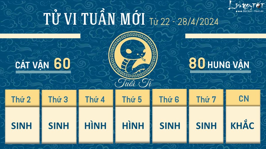 Tuần này có thể vì yêu cầu công việc mà tuổi Tị sẽ phải đi lại khá nhiều, cũng một phần là do bản mệnh chủ động muốn vậy. Tuy nhiên không cần phải lo lắng quá nhiều vì những chuyến đi của bạn đều an toàn và có cả chút “lộc” may mắn, càng năng nổ thì càng dễ gặt hái thành tích.