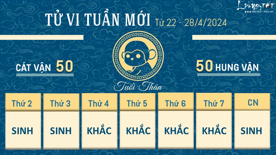 Hung tinh Bạch Hổ báo hiệu thử thách và khó khăn đang tiến đến rất gần với con giáp tuổi Thân trong tuần này. Tuy nhiên, bạn khoan vội chùn bước vì năng lực là những gì bạn đang có. Sự linh hoạt, nhạy bén kết hợp với ý chí bền vững sẽ giúp bạn mau chóng vượt qua những thử thách trước mắt.