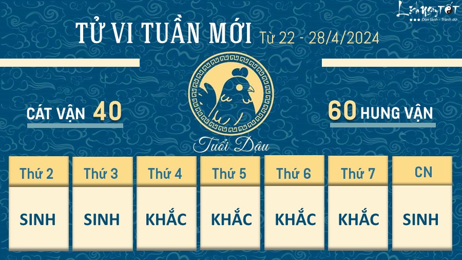 Do tuần này vận khí ảm đạm nên tuổi này còn phải thận trọng trong những việc liên quan tới tiền bạc. Đặc biệt là người kinh doanh lớn phải đề phòng có kẻ muốn phá chuyện làm ăn của bạn, tốt nhất nên giữ đầu óc tỉnh táo và có phương án phòng ngừa.