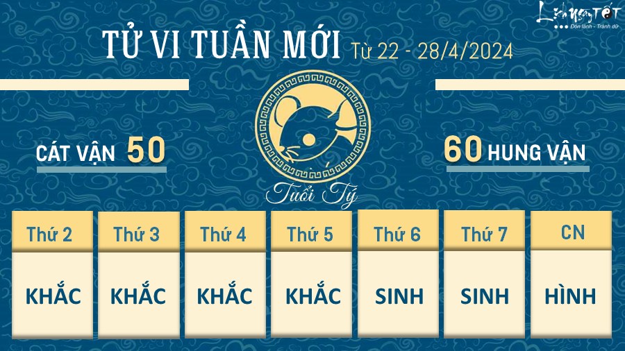 Người tuổi Tý chịu tác động của hung tinh Ngũ Quỷ nên vận trình tuần mới nhiều sa sút. Các kế hoạch của bạn đứng trước nhiều điềm xui, dễ xuất hiện biến cố, công việc đổ bể. Năng lực làm việc của bạn cũng vì thế mà bị nghi ngờ, khiến tinh thần vô cùng ảm đạm.