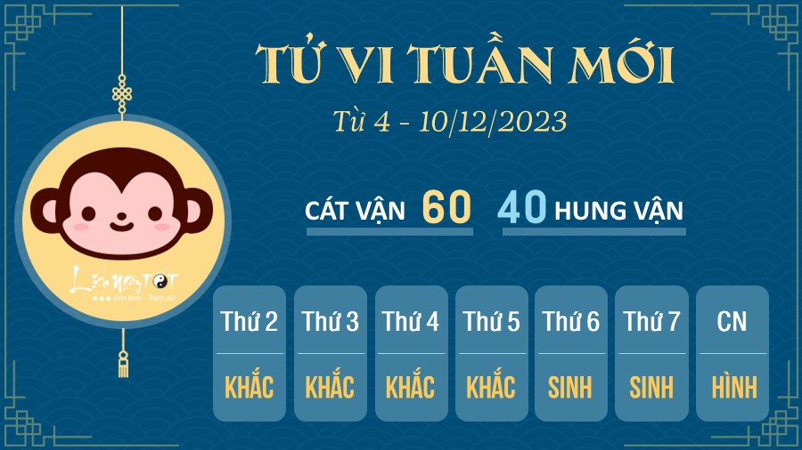 Tuổi Thân thể hiện bản thân khá tốt trong tuần mới nên các phương diện đều tiến triển đều đặn. Càng về cuối năm, càng có nhiều cơ hội và thách thức mở ra trước mắt, tuy nhiên bằng sự nhạy bén và thông minh của mình, bạn đều có thể giải quyết ổn thỏa mọi thứ, giành được thành tích tốt.