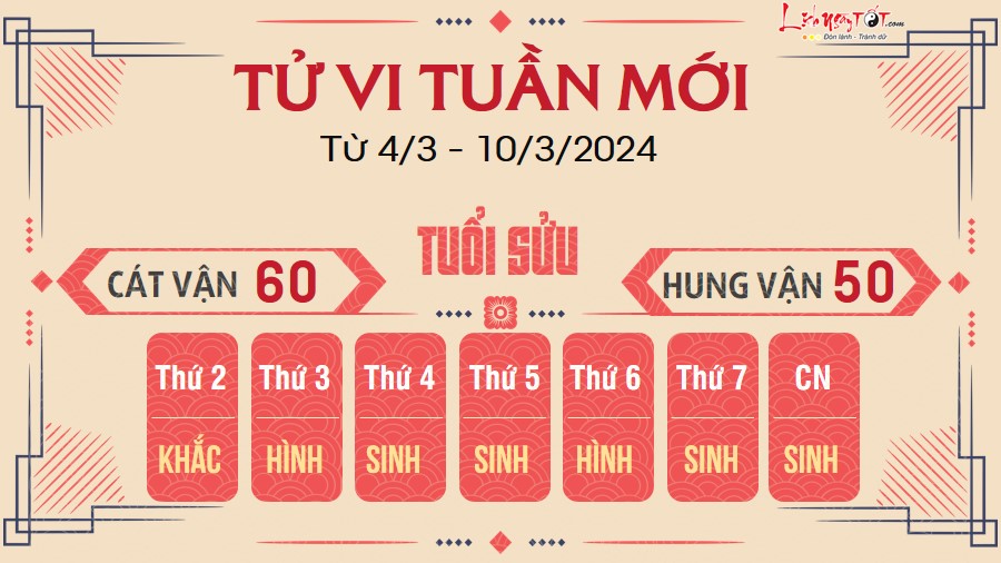 Người tuổi Sửu có thể sẽ gặp phải một vài khó khăn trên phương diện sự nghiệp vào thời điểm đầu tuần, nhưng sau đó mọi người xung quanh sẽ dần hiểu được ý định của bạn, chuyển sang ủng hộ bạn nhiều hơn, khiến mọi việc tiến triển suôn sẻ hơn hẳn.