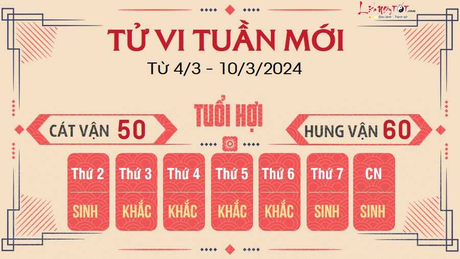 Người tuổi Hợi có thể được lãnh đạo giao cho nhiệm vụ trọng đại trong tuần này. Quá trình thực hiện, bản mệnh sẽ gặp phải nhiều khó khăn, song đừng vì thế mà cảm thấy chán nản hay tự ti. Bạn vốn là người có tài, chỉ cần cố gắng thì dần dần sẽ tìm ra cách giải quyết.
