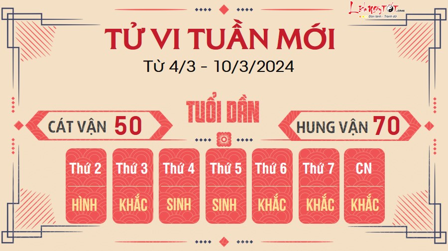 Xem tử vi tuần mới của 12 con giáp từ 4 - 10/3/2024, người tuổi Dần hãy chú ý đến mối quan hệ với lãnh đạo trong tuần này. Nếu bạn hành xử khiêm tốn, chăm chú lắng nghe lời cấp trên thì dễ được yêu mến, được trao cơ hội phát triển bản thân. Còn nếu bạn quá kiêu ngạo, làm việc theo ý mình thì dễ phạm lỗi sai, bị khiển trách.