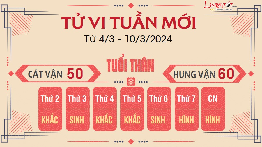 Người tuổi Thân hãy mạnh dạn làm những gì mình cho là đúng trong tuần này và dùng thành quả thực tế để chứng minh bản thân. Bạn không nên nản lòng khi gặp phải khó khăn hoặc nghe phải lời bàn lùi từ mọi người xung quanh.