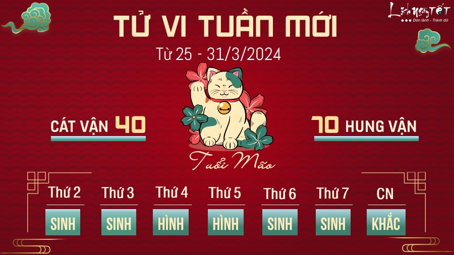 Hung tinh Thái Tuế tác động, người tuổi Mão phải chịu không ít khó khăn và thách thức trong tuần này. Đầu tiên phải kể đến đường công danh sự nghiệp không được ổn định cho lắm. Con giáp này nên hạn chế tối đa những mâu thuẫn, tranh cãi với người khác ở thời điểm này để tránh những thị phi không đáng có.