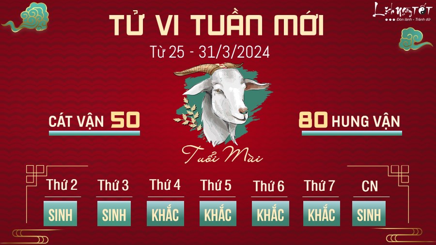 Hung tinh Bạch Hổ dự báo, tuổi Mùi có thể gặp nhiều chuyện xui xẻo trong tuần này, thậm chí có thời điểm bạn còn nghĩ rằng dường như may mắn đã bỏ quên mình. Hung tinh đeo bám có thể gây ra những điều bất trắc bất cứ lúc nào, nhìn chung bạn phải điều chỉnh lại các kế hoạch cho thận trọng và giữ an toàn cho chính mình.