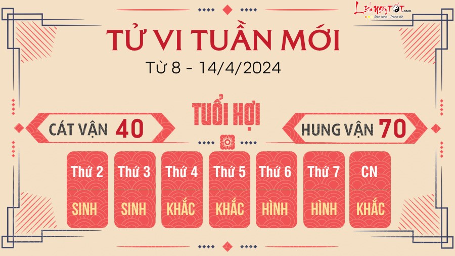 Hợi gặp bộ đôi Thiên Hình đi với Tiểu Hao nên được nhắc nhở là phải kiềm chế tính cách nóng nảy của bản thân, không tham gia vào chuyện của người khác và bớt lo xa trong tuần mới.