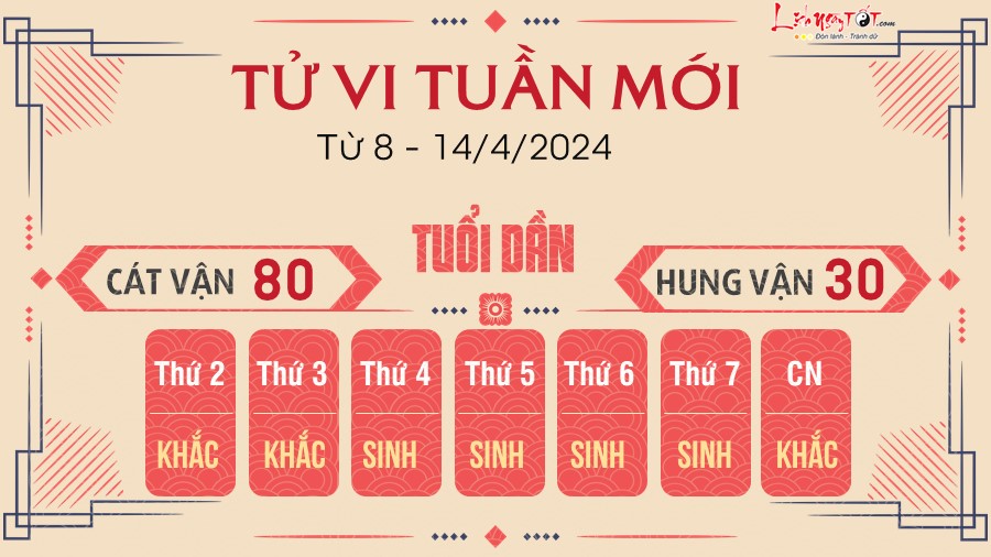 Tiếp nối tử vi tuần cũ, Dịch Mã đi cùng Nguyệt Mã cát tinh giúp tuổi Dần cực đỏ trong tuần mới, tháng mới niềm vui mới, mọi điều hân hoan và dễ gặp nhiều tin vui bất ngờ trong công việc, tiền bạc.